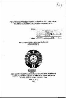 Determination of optimum routes often result different values. This is caused by the methods used have different calculations. The purpose of the optimum route itself is to find the best trajectory of the two pairs of vertices contained in a map or graph. We have applied A* algorithm for the test. This algorithm has the evaluation function to assist the search. The function is called heuristic. Two methods which have been introduced as a step to obtain the value of heuristic function are by using Euclidean and Manhattan distance. Both of these methods has resulted the optimum distance in shortest path problem, but these functions gain the different results. So we have develoved a research on the heuristic function using Euclidean, Manhattan, Euclidean Square and using a new method (ANDYSAH) to compare the results. Penentuan rute optimum sering menghasilkan nilai yang berbeda. Ini disebabkan oleh metode yang digunakan mempunyai perhitungan yang berbeda-beda. Tujuan dari rute optimum itu sendiri adalah untuk mencari lintasan terbaik dari 2 pasang verteks yang terdapat pada suatu peta atau graph. Algoritma pencarian yang diterapkan pada pengujian adalah A*. Algoritma ini mempunyai fungsi evaluasi yang berfungsi untuk membantu pencarian, yaitu fungsi heuristik. Untuk mendapatkan nilai optimum global bergantung pada kinerja fungsi. Dua buah metode yang telah diperkenalkan sebagai langkah untuk mendapatkan nilai fungsi heuristik, antara lain dengan menggunakan jarak Euclidean dan jarak Manhattan. Kedua metode ini telah menghasilkan jarak yang optimum pada permasalahan shoretest path, tetapi kedua fungsi ini menghasilkan jarak yang berbeda. Dengan itu, telah dilakukan penelitian terhadap fungsi heuristik dengan menggunakan metode Euclidean, Manhattan, Euclidean Kuadrat dan dengan menggunakan metode yang baru (ANDYSAH).
